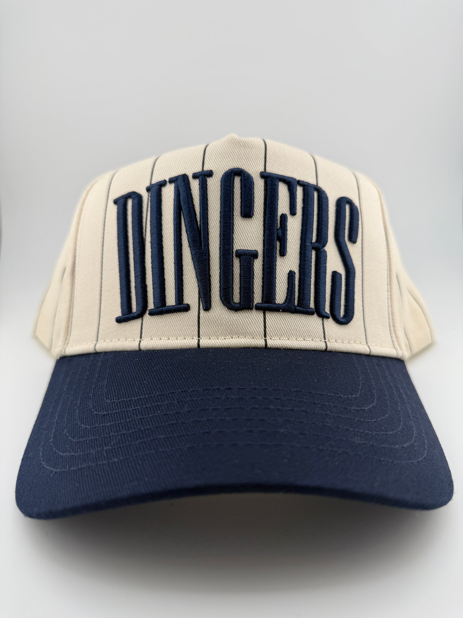 The ultimate hat for baseball season. This navy striped vintage trucker hat features our first-ever striped profile, making it a standout addition to any casual lineup. Finished with bold navy Dingers 3D embroidery and an adjustable snapback closure, it blends classic sports style with modern edge—perfect for game days, tailgates, and everyday wear.